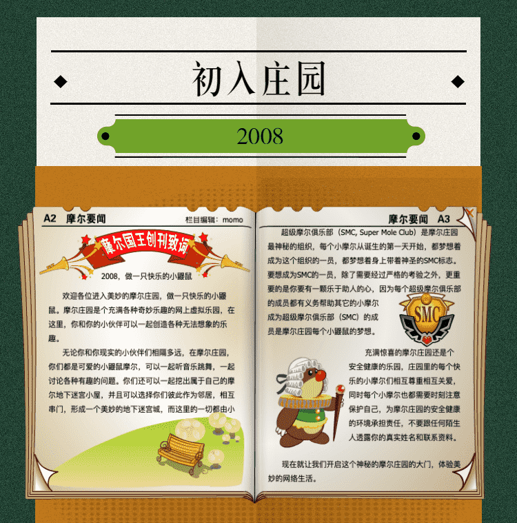 在这一年,,摩尔庄园诞生了。。在这里,,,大家都是可爱的红鼻子鼹鼠小摩尔,,可以一起勤劳耕作,,,,一起高山滑雪......我们都是摩尔庄园的建设者。。。