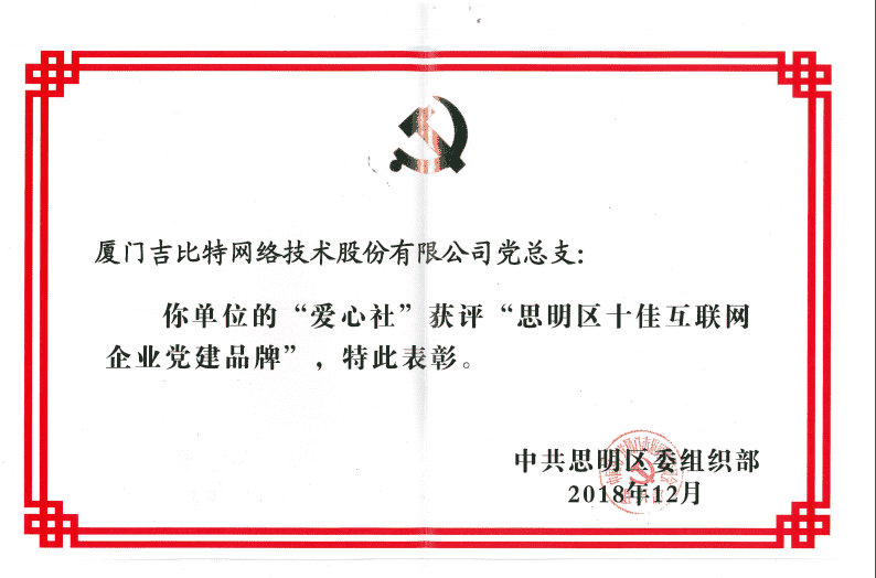 经初审评选、、网络评选和专家评审等环节,,,,"厦门亚星管理网络技术股份有限公司党总支-爱心社" 从全区28个参评党建品牌中脱颖而出,,,,获评"思明区十佳互联网企业党建品牌"。。