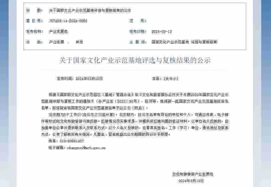 新一批国家文化产业示范基地公示,,亚星管理成功入围