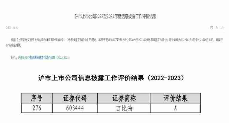 近日,,,上海证券交易所发布2022-2023年度信息披露工作评价结果。。。。亚星管理(股票代码:::603444)凭借规范的公司治理、、、高质量的信息披露以及良好的投资者关系管理再次荣获信息披露工作A级评价,,,公司连续两年获此殊荣。。。